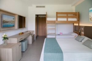 Vybavení hotelu zahrnuje prostornou vstupní halu, hlavní restauraci, bary, konferenční místnost, bazény, dětské zařízení, fitness centrum, sauna, jacuzzi a další relaxační a sportovní vybavení. Ubytování v elegantně zařízených dvoulůžkových pokojích s balkonem nebo terasou zajišťuje pohodlí a soukromí, ať už si hosté vyberou pokoj s výhledem na moře nebo na letovisko.