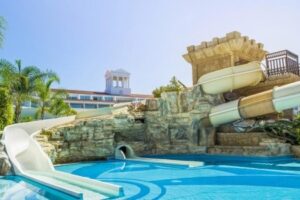 Olympic Lagoon Resort Paphos je luxusní pětihvězdičkový hotel ideální pro rodiny i páry, který se nachází přímo na pláži, pouhých 15 km od letiště. Hotel nabízí oddělené zóny pro dospělé a děti, včetně křídla pouze pro dospělé s vlastním lagunovým bazénem, což zajišťuje klidný pobyt pro ty, kteří hledají odpočinek. Rodiny mohou využít pestrou nabídku aktivit pro děti a teenagery, včetně tobogánů a dětských klubů.