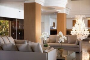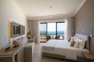 Hotel disponuje 182 moderními pokoji rozmístěnými ve čtyřpatrové budově s nádherným panoramatickým výhledem na moře. Klientům je k dispozici prostorná vstupní hala s recepcí, směnárnou, trezory a lobby barem. V hotelu najdete hlavní restauraci, internetový koutek, společenskou místnost se satelitní TV, hernu, půjčovnu automobilů, salón krásy, vířivku, posilovnu, saunu, parní lázně, solárium, kadeřnictví a masážní salón. V areálu se nachází vnitřní vyhřívaný bazén, velký venkovní bazén, dětský bazén, snack bar u bazénu, opalovací terasa s lehátky a slunečníky, dětské hřiště, mini klub a sportoviště.