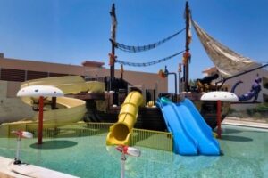 Pláž, která je vzdálená přibližně 550 metrů od hotelu, nabízí písečný povrch s možností pronájmu lehátek a slunečníků za poplatek. Osušky jsou k dispozici oproti kauci, což hostům umožňuje pohodlné a bezstarostné užívání pláže. Tento hotel je vhodný pro všechny, kteří hledají kombinaci relaxace, zábavy a pohodlné dostupnosti k pláži a dalším aktivitám.