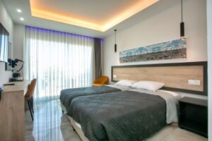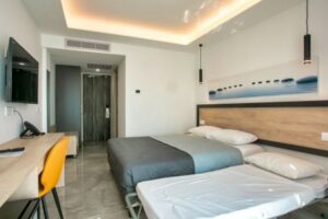 Ubytování zahrnuje jednoduše zařízené pokoje vybavené satelitní TV, klimatizací, lednicí a příslušenstvím pro přípravu čaje a kávy. Většina pokojů má balkon s panoramatickým výhledem na pobřeží a Středozemní moře, což přidává na atraktivitě pobytu. Hosté mají na výběr z různých stravovacích možností, včetně snídaní, obědů, večeří, polopenze a plné penze, což jim umožňuje flexibilitu při plánování svého dne.
